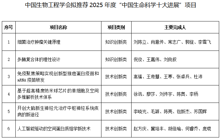 为推动生命科学研究和技术创新,充分展示和宣传我国生命科学领域的重大科学和技术成果,按照中国科协生命科学学会联合体的有关要求,依据《中国生命科学十大进展评选办法》,以“公平、公正、公开”为原则,继续开展了2025年度“中国生命科学十大进展”项目评选工作。现将拟推荐项目予以公示,公示期自2025年10月22日至10月28日。